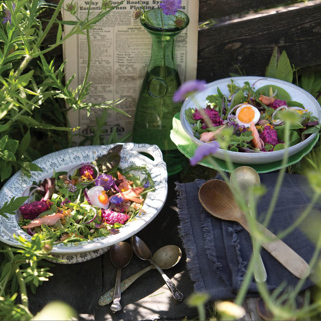 Salad leaves (I’m picking from my garden and have rocket, purple spinach and mustard leaves) but again anything works