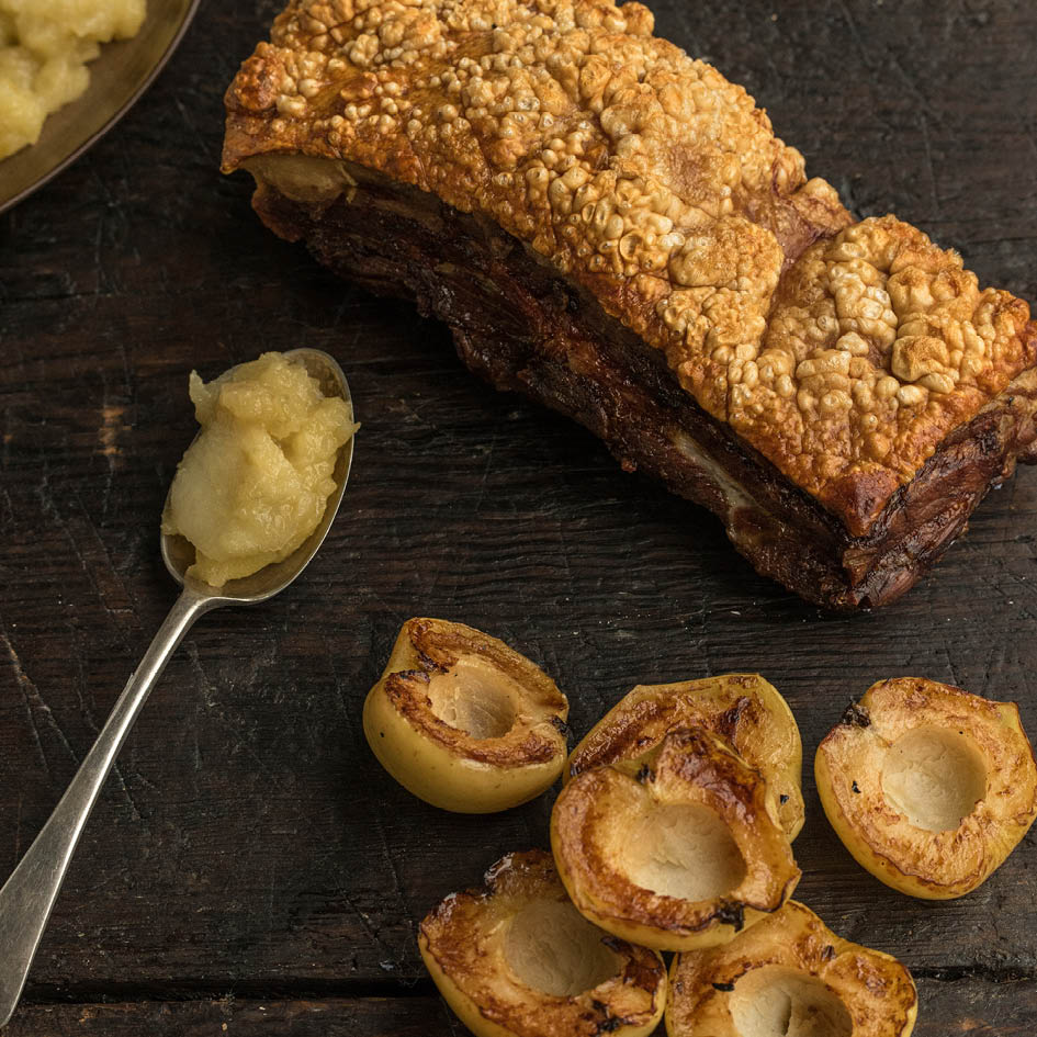 About 30 minutes before the pork is due to come out of the oven, cut each of the remaining apples in half and use a melon baller to remove the core. Immediately place them in the oven with the pork and roast for the remaining 30 minutes or until they are tender and lightly browned. Leave the pork belly to rest for five minutes after it comes out of the oven, then cut into serving portions and serve with the apple sauce and apples. I always serve the apple sauce at room temperature, but it can be reheated.