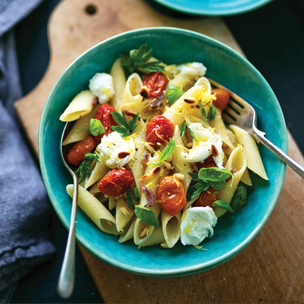 This time of year, for me, is all about tomatoes – in all shapes, tastes, colours and sizes. One dish I love to make is a pasta dish, full of tomato flavour. But because it’s summer, I keep it lighter by sun blushing the little red jewels in the oven – the flavour intensifies and just explodes in your mouth.