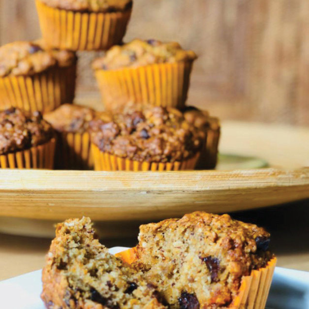 Pour the wet ingredients into the dry and blend together. The mix should have no flour showing but will be lumpy. In the final strokes add the raisins and chocolate chips. Spoon the mixture equally between the 12 muffin cases.