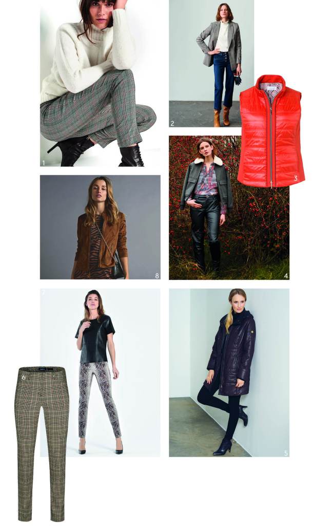 1. TONI Jenny checked trousers £99.95 TONI Giselle jumper £89.95 2. TONI Liv Culottes £89.95 TONI checked blazer £169.95 | 3. Just White red gilet £129.95 | 4. TONI Bella blouse £89.95 | 5. Junge coat £199.95 | 6. Robell Rose checked pull on trousers £64.95 | 7. Robell Rose snake print trousers £89.95 | 8. Just White faux suede jacket £139.95 Just White dress £129.95