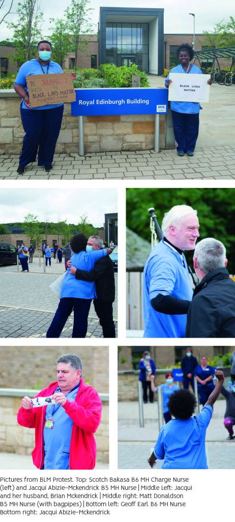 Jacqui organised a BLM protest at Royal Edinburgh Hospital on 8 July this year, along with SCOT BAME’s Leader, Oudwin Griffith (Senior Clinical Nurse Specialist in Interventional Neuroradiology at QEUH, Glasgow and Chair of NHS GGC BAME Staff Network), Geoff Earl and Scotch Bakasa