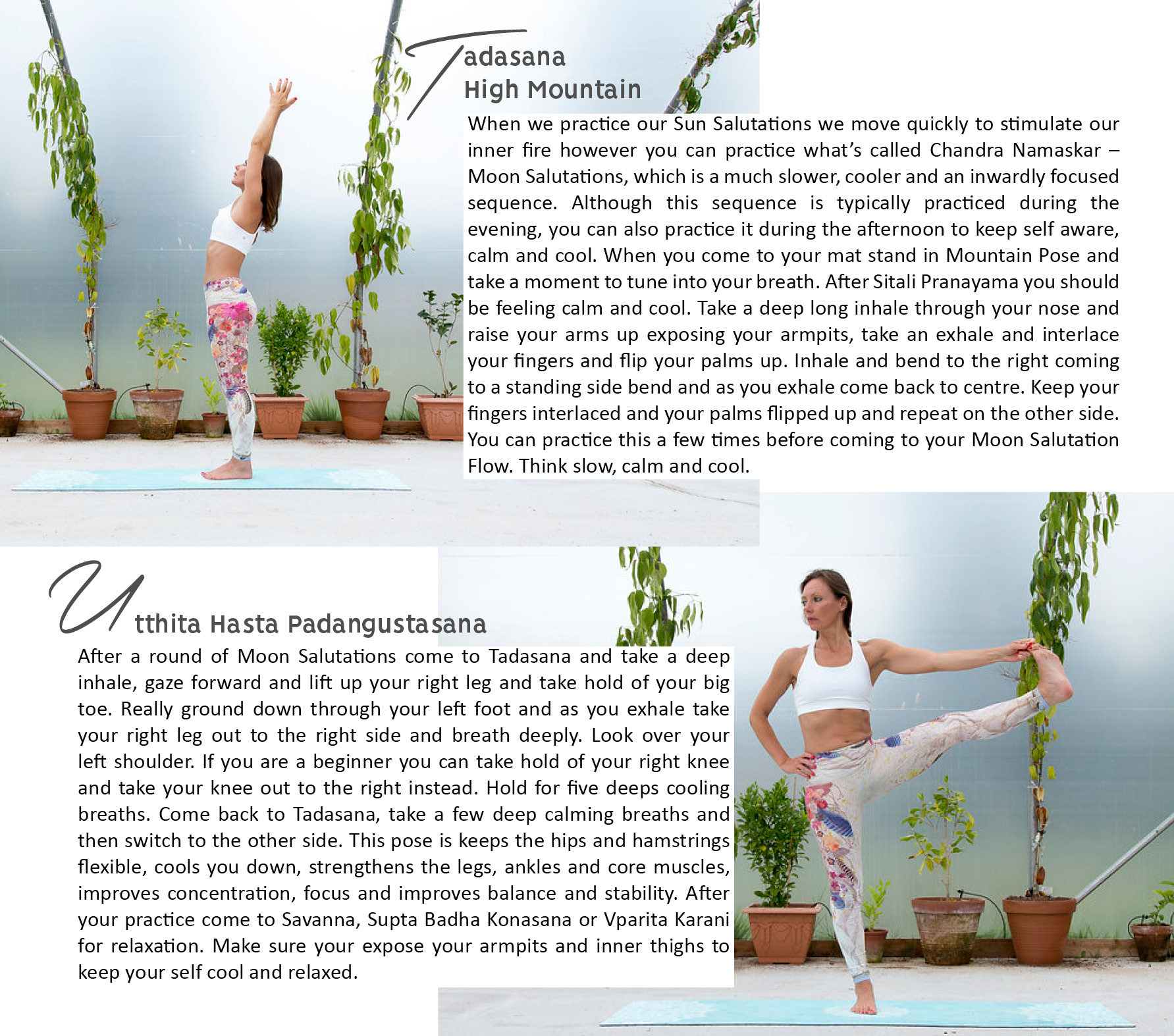Summer is here! What a joy it is to witness the trees and flowers unfolding and to enjoy lighter, longer and warmer days. Summer is a time of increased fire and heat and it’s important to keep cool during your yoga practice. Avoid practicing yoga at midday, this is when the sun is at its hottest and according to Ayurveda, our Pitta digestive fire is at its strongest and can cause an imbalance. Think about a practice that is calming, nourishing and cooling, and a diet that is pitta pacifying. There are many ways to keep your pitta balanced, you can practice slower pranayama (breathing techniques) before your practice such as Nadi Shodana (alternate nostril breathing) or Sitali pranayama – both are cooling and calming. There are also certain yoga poses which will help release the excess heat too.