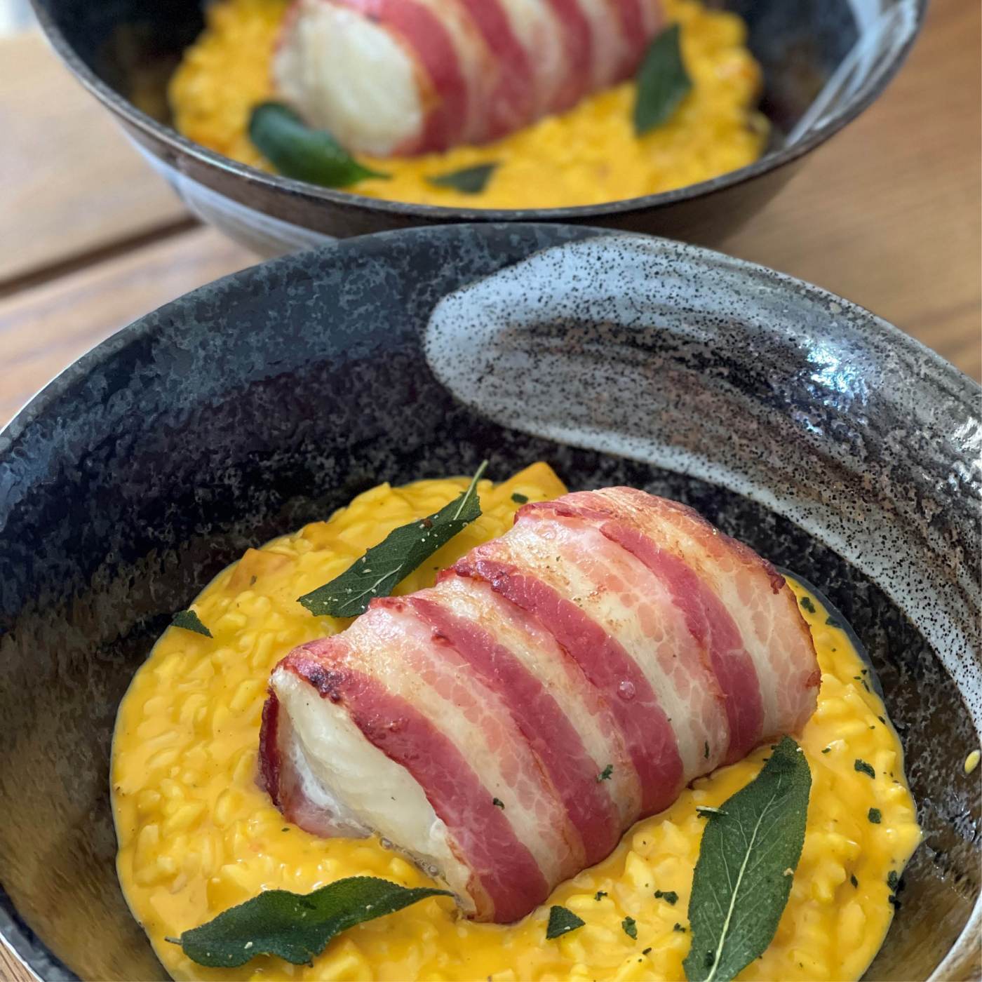 Bacon-wrapped Cod with Butternut & Sage Risotto (serves 2)