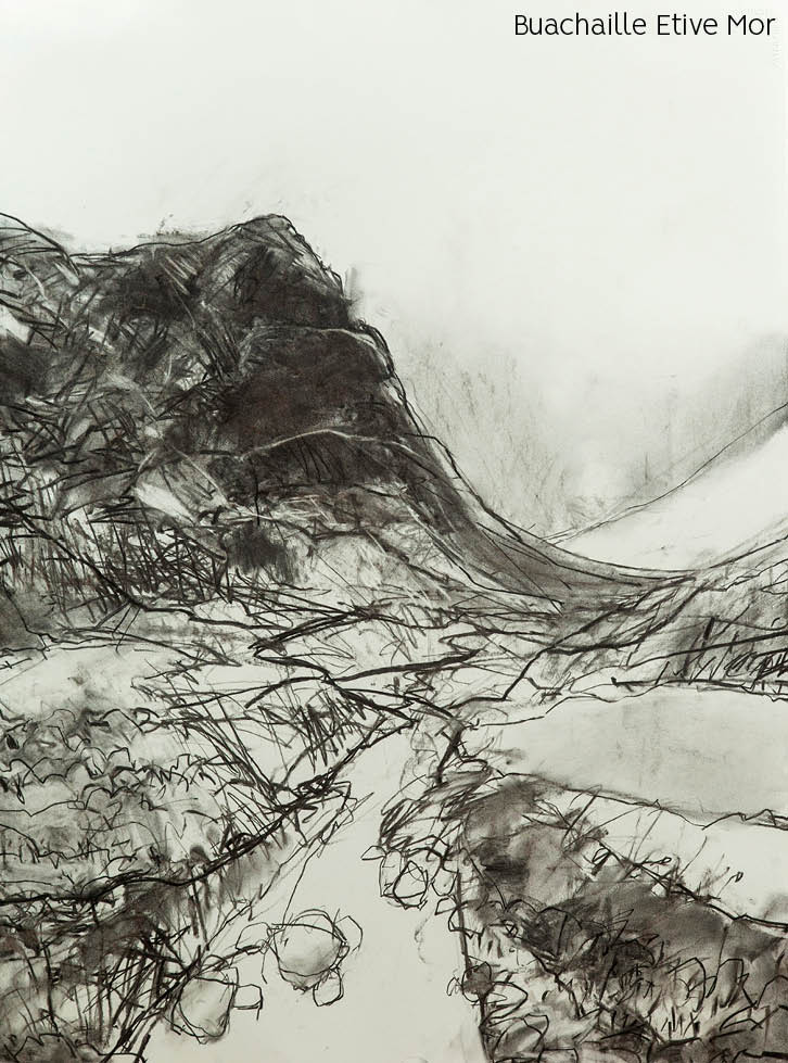 Up with the Larks is a landscape exhibition of process, from figuration toward abstraction. The works include a series of drawings from a traditional, single point of view and move toward a more painterly abstraction that owes more to storytelling, becoming a narrative journey through the landscape. The title Up with the Larks came about when Dominique was listening to an album (of the same name) by Scottish rock band, The Pearlfishers. The title reflects the feeling of getting out and about with a sense of optimism for what the day ahead might bring and references Dominique’s curiosity about exploring Scotland and the encounters in meeting and making new stories of our landscape.