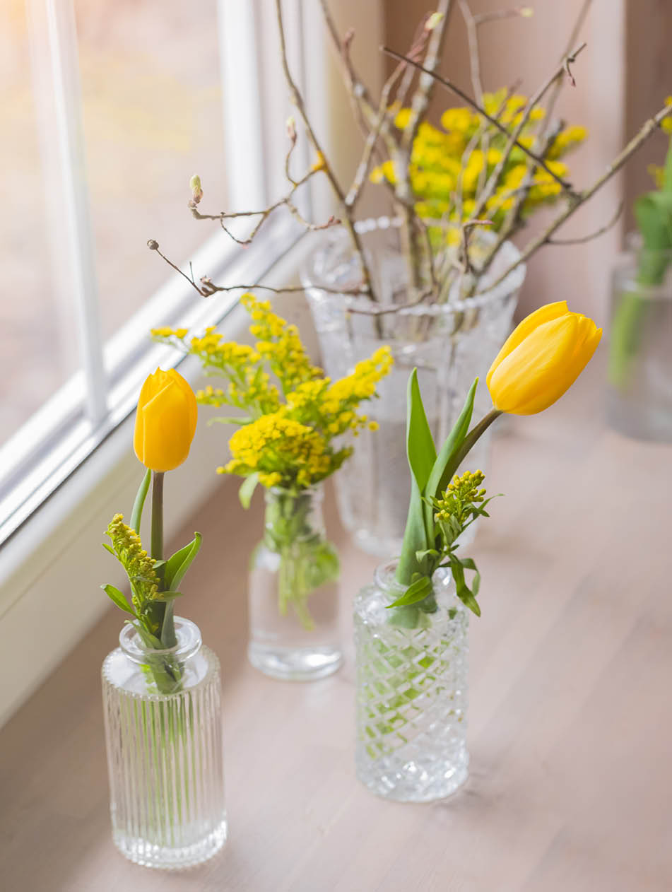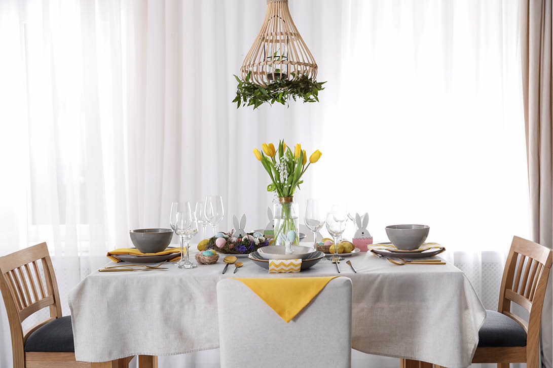 One of the easiest and most obvious ways to decorate for Easter is with seasonal flowers. Select blooms from around the garden or forage for wildflowers to fill one large central vase, a selection of bud vases, or even egg cups to create a stunning floral display. Massed bouquets of one flower also look striking, and the lower price of daffodils makes this a cost-effective option.