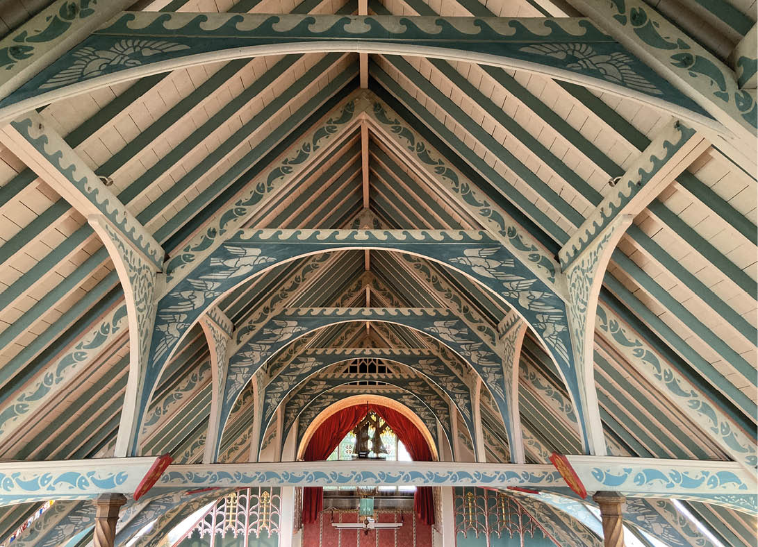The open timber roof is the most immediately striking feature, perhaps resembling the hull of a boat. Its beams are painted and stencilled with stylised fish, birds and waves in blue and white. The roof also has eight decorative red shields, with designs picked out in gold representing the four gospels and other religious symbols. The ceiling of the chancel is stencilled as well, this time in cream and red, along with a model fishing boat displayed on a tie-beam.