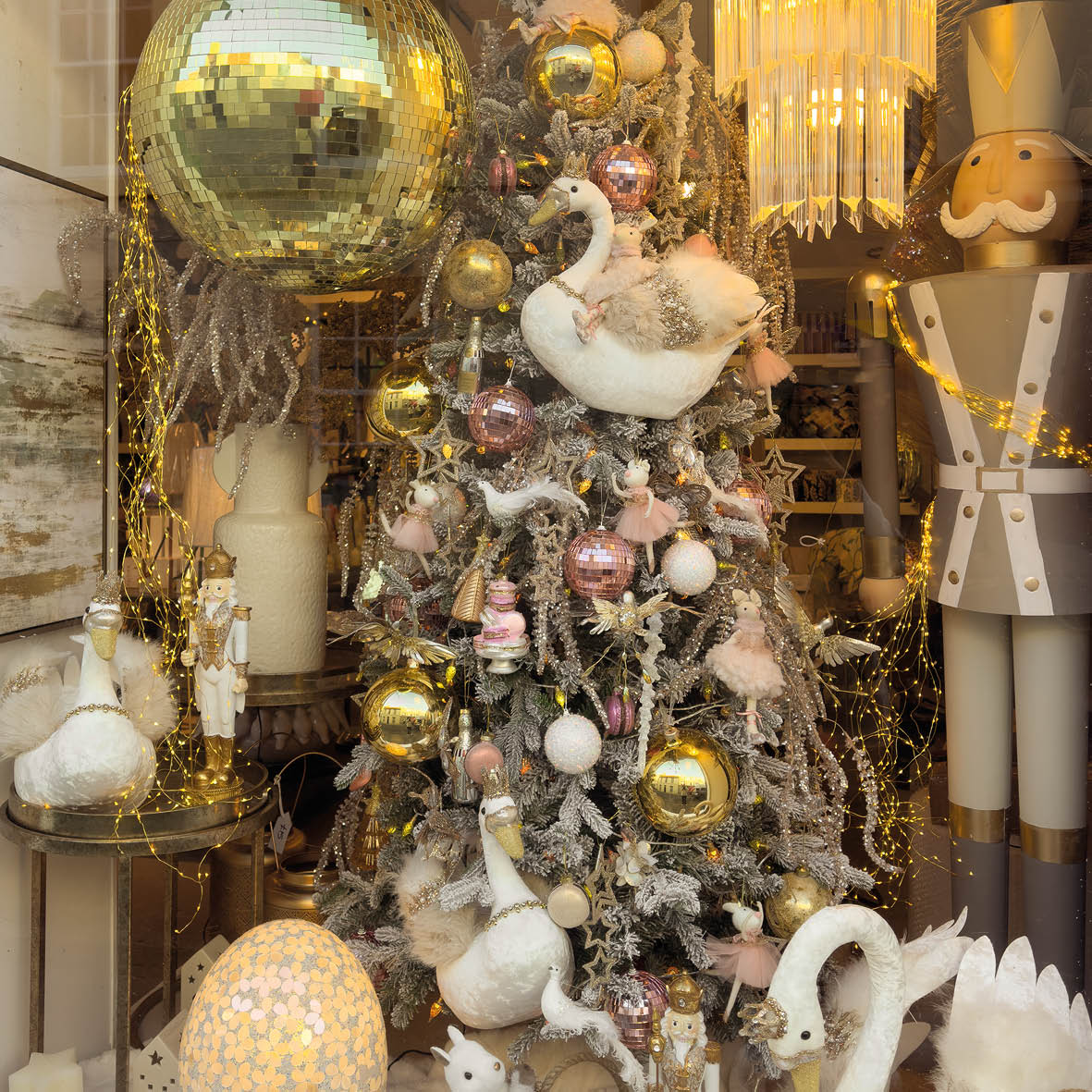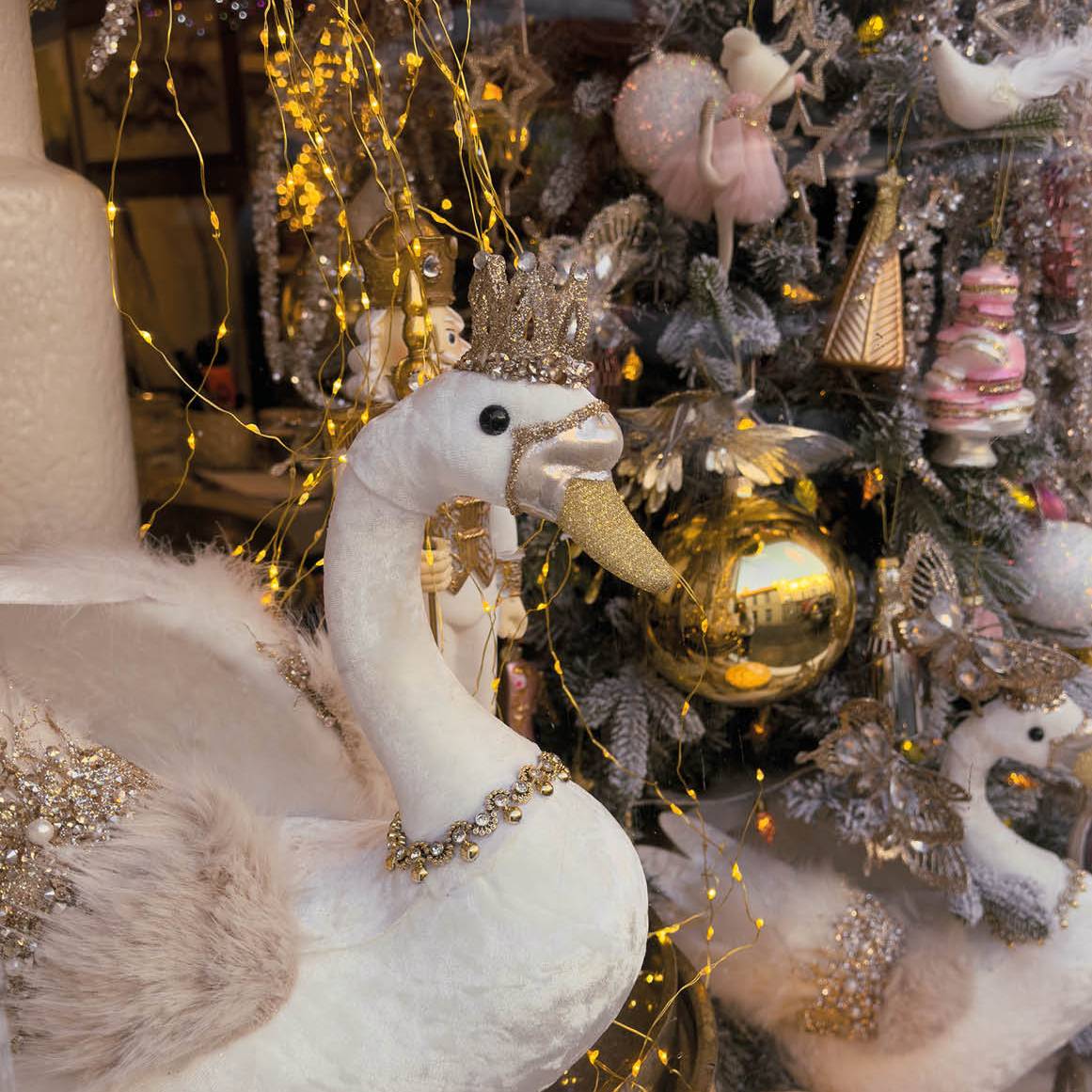 Dance of the Swans embraces the playful spirit of the dopamine decorating trend, and there are no rules here. It’s kitsch, perfect for maximalism aficionados, and joy is guaranteed. The palette features yellow gold, soft blush pink and dreamy white, complemented by eye-catching decorations that invite a second glance. Trees are beautifully dressed with charming ballerinas, sparkling ornaments and champagne bottles. Oversized disco balls and pearl-adorned swans transport you to a whimsical Christmas ballet!