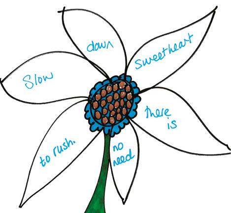 One day, my son hopped into the car beside me and said, “Mum, I can’t wait until I’m taller than you”. He was about half an inch away. When I started to write this book nine months later, he had overtaken me by a good couple of inches. But as I sat in the car that morning, his words made me smile. Yet I also felt for him, remembering, all too well, the angst of teenage growing years. His height is ever present in his race to manhood – the rush to leave childhood spurring him on. A few weeks before, he had asked if he could go to Amsterdam for the day with his friends (he was 14), and I heard myself saying to him, “Slow down sweetheart there is no need to rush.” Over nine months, I doodled 277 flower doodles, one every day, almost like daily meditation. Then one day I didn’t…The doodles throughout this book will take you on an internal journey, enabling you to bring some of those parts of yourself home, and as you do, you will get their permission to shine. Take your time. We miss all the beautiful, uplifting moments when we rush, so “slow down sweetheart there is no need to rush”.